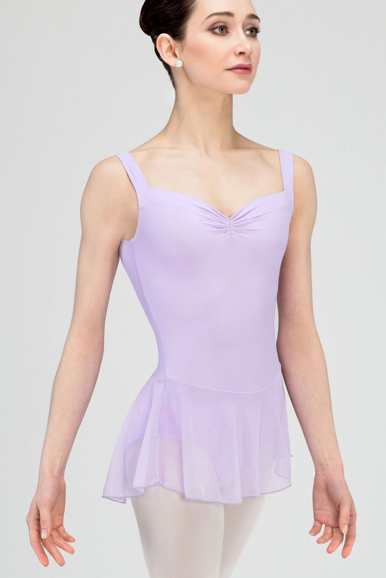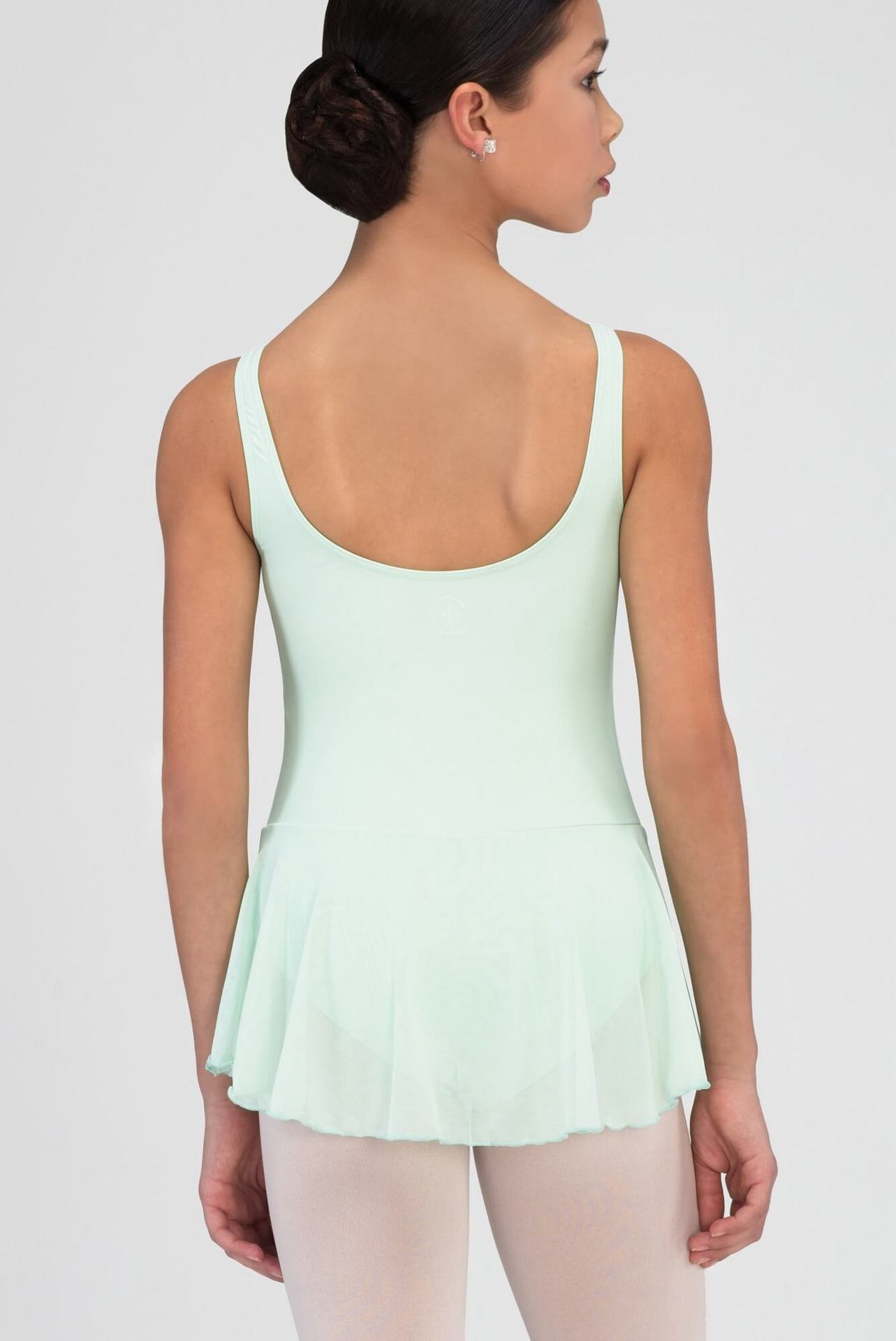 Microfiber basic tank dress with front pinch. Full front lining, U-cut back and attached four-way stretch tulle skirt.